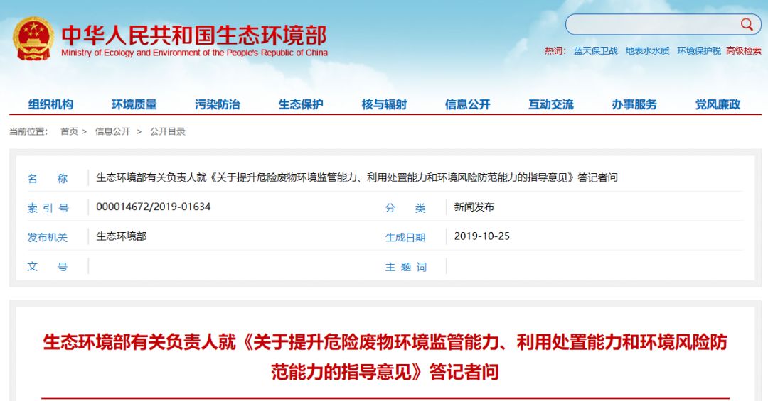 2019年10月25日,生態環境部有關負責人就《指導意見》出臺的背景、目標、環境監管體系如何建設、利用處置能力如何強化、環境風險如何防控等內容也做了解答。
