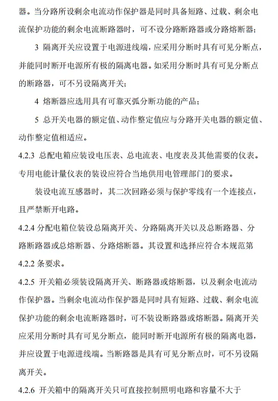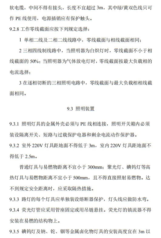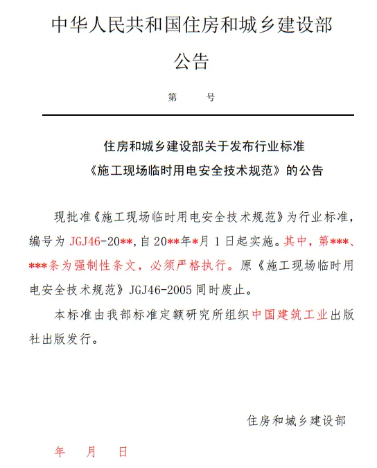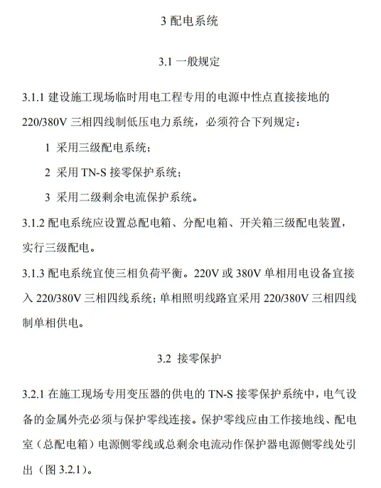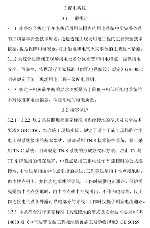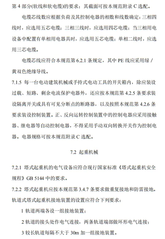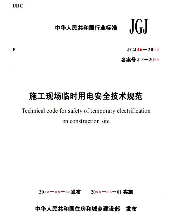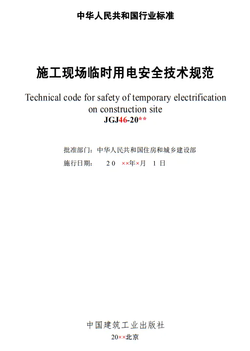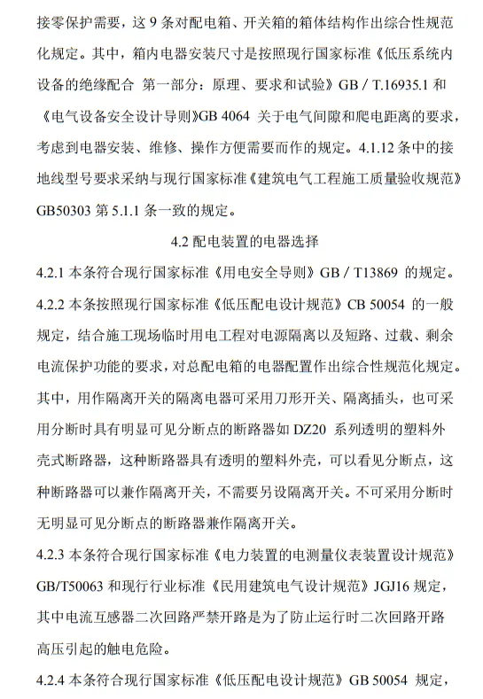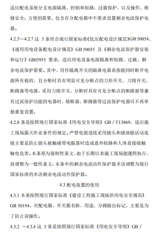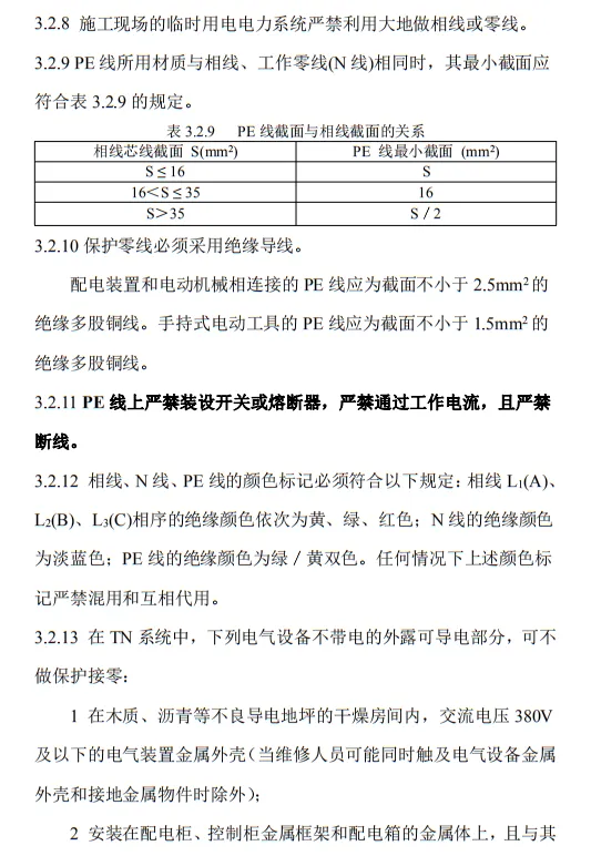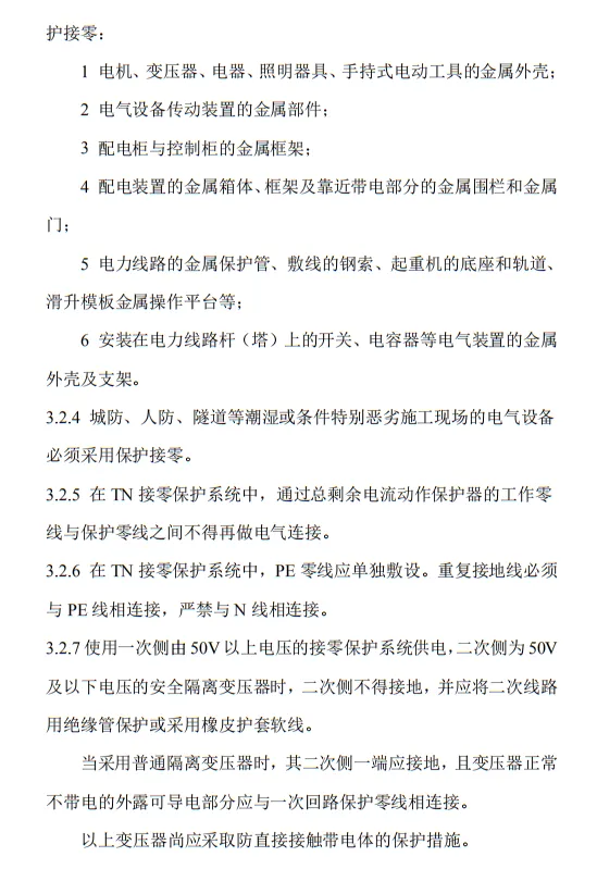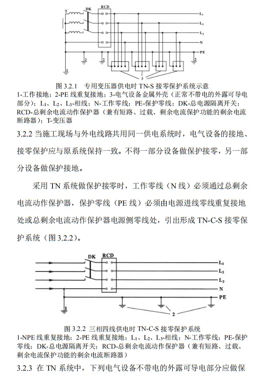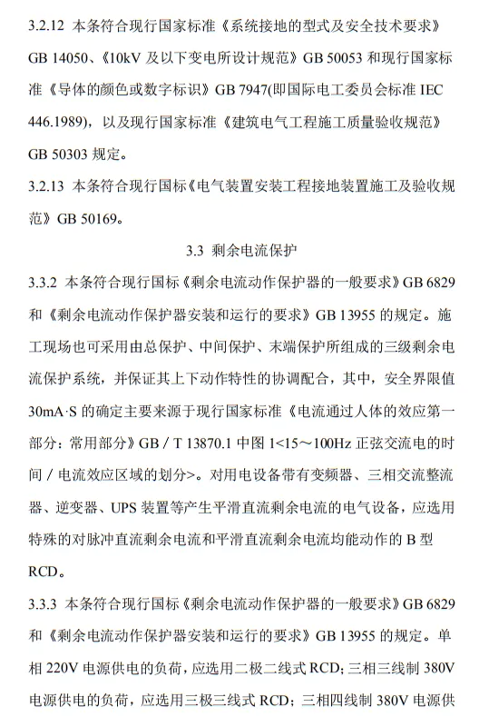 近日,住建部官網發布文件,對行業標準《施工現場臨時用電安全技術規范(征求意見稿)》公開征求意見。2、增設“剩余電流保護”為正文單獨一節,補充對剩余電流保護的規定;3、將原“配電箱及開關箱”一章更名為“配電裝置”;4、補充鋼索配線中對鋼索的截面、布設以及固定的規定;5、增加對采用專用電纜線路供電的起重機,可采用兩級配電方式的規定;6、補充臨時用電工程管理需完善安全技術檔案的規定;經整理,此次征求意見稿中共有11條強制性條文。分別如下:3.2.11 PE線上嚴禁裝設開關或熔斷器,嚴禁通過工作電流,且嚴禁斷線。