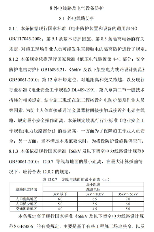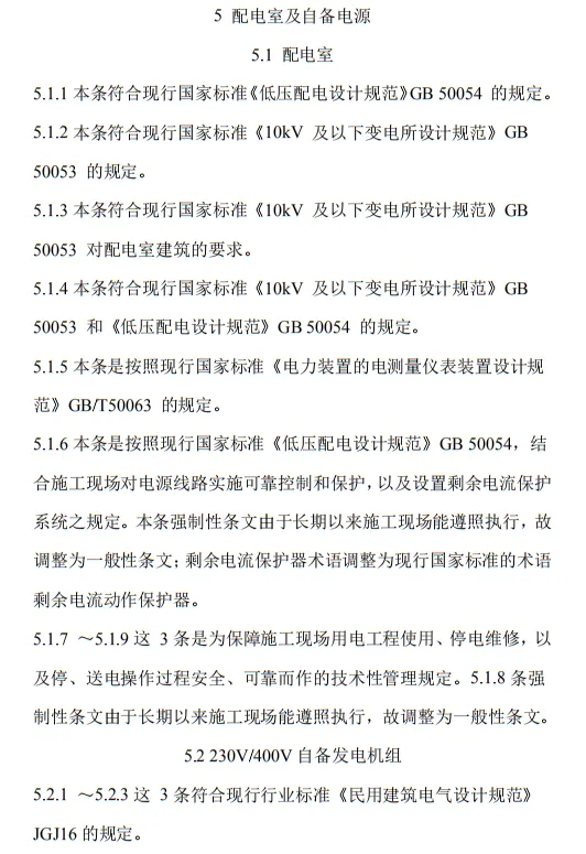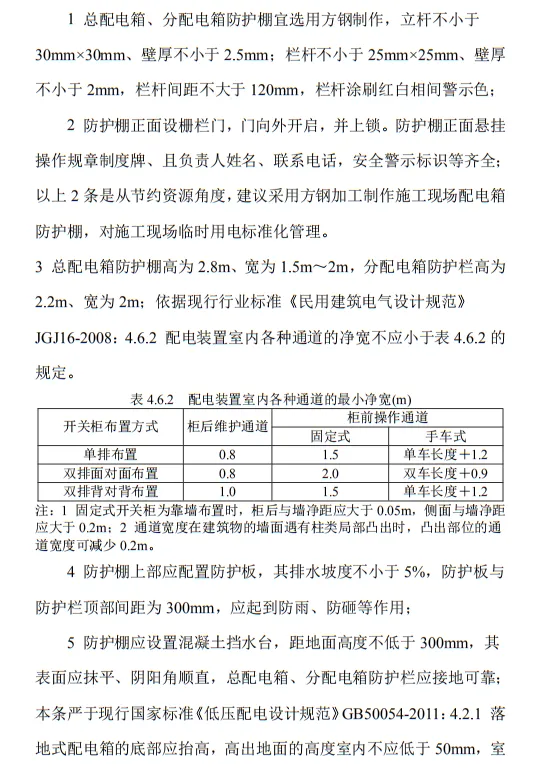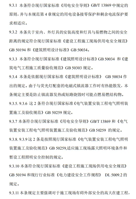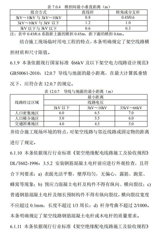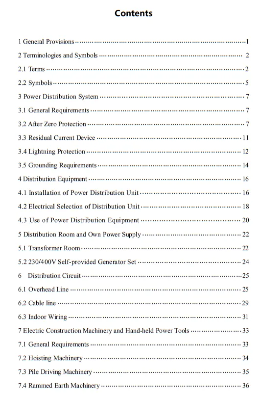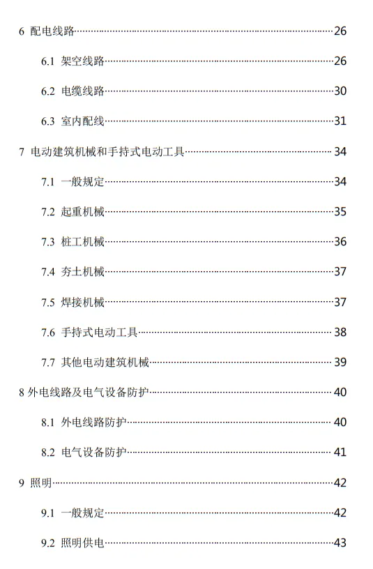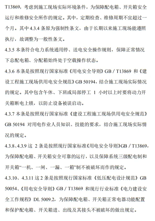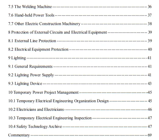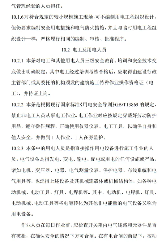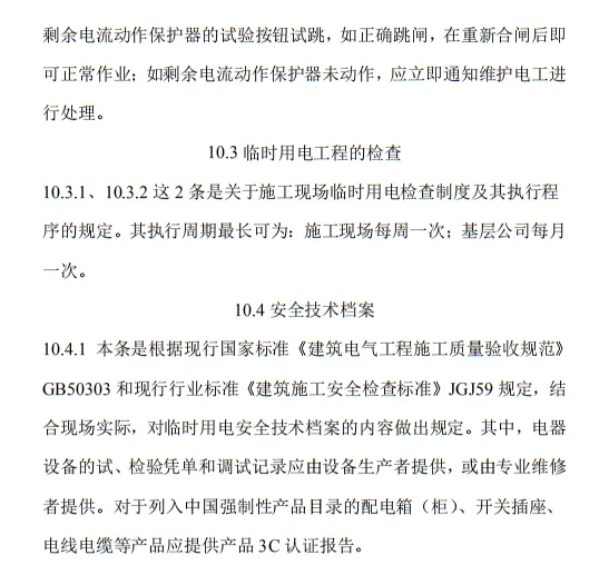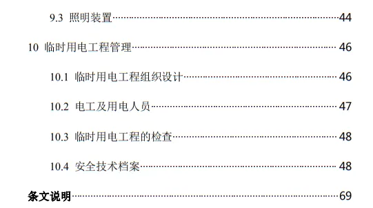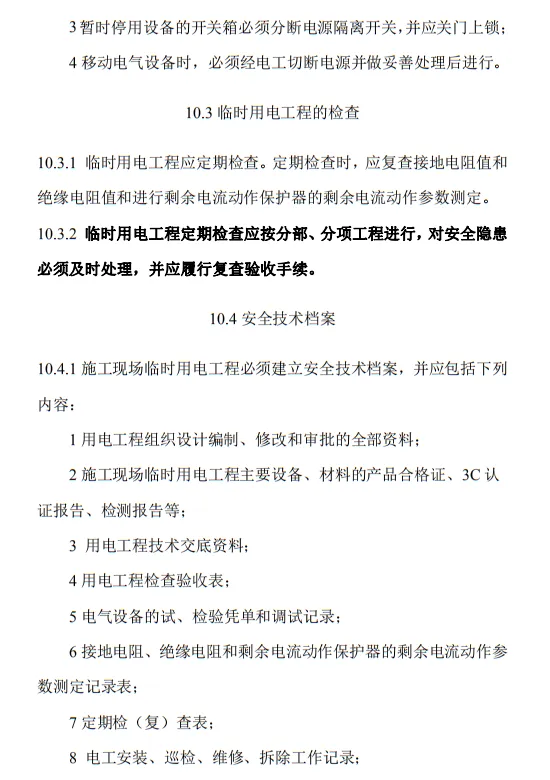 10.3.2 臨時用電工程定期檢查應按分部、分項工程進行,對安全隱患必須及時處理,并應履行復查驗收手續。條文的主要內容包括10部分:1.總則;2.術語、代號;3.配電系統;4.配電裝置;5.配電室及自備電源;6.配電線路;7.電動建筑機械和手持式電動工具;8.外線電路及電氣設備防護;9.照明;10.臨時用電工程管理。
