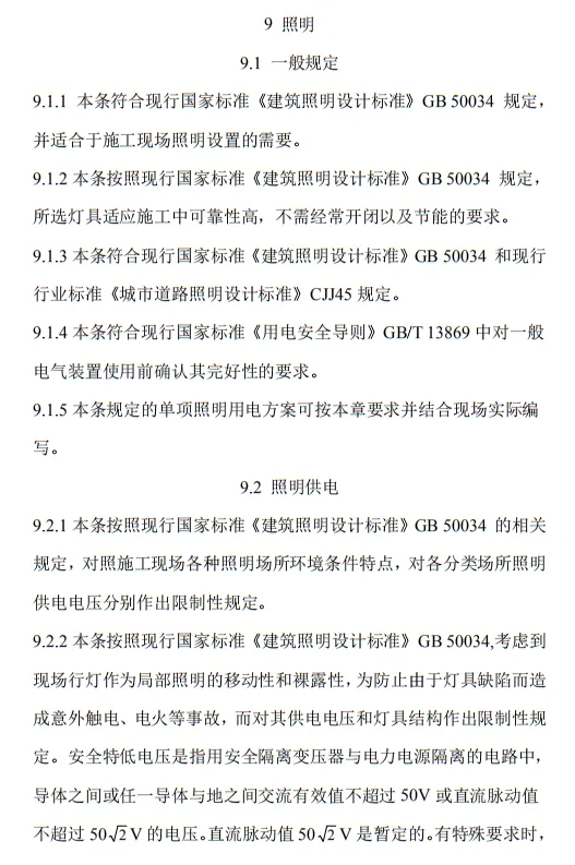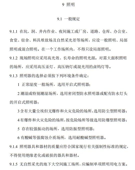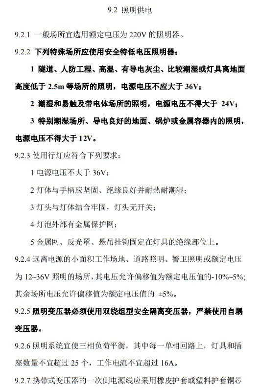 9.2.2 下列特殊場所應使用安全特低電壓照明器:1 隧道、人防工程、高溫、有導電灰塵、比較潮濕或燈具離地面高度低于2.5m等場所的照明,電源電壓不應大于36V;2 潮濕和易觸及帶電體場所的照明,電源電壓不得大于 24V;3 特別潮濕場所、導電良好的地面、鍋爐或金屬容器內的照明,電源電壓不得大于12V。