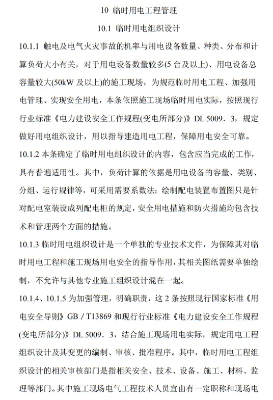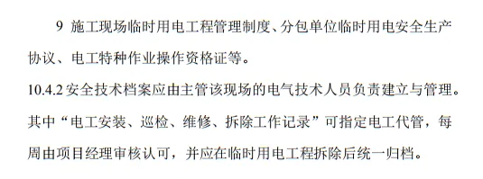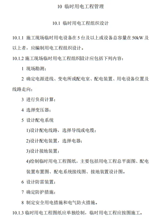 10.1.4 臨時用電工程組織設計編制及變更時,必須履行“編制、審核、批準”程序,由電氣工程技術人員組織編制,經相關部門審核及具有法人資格企業的技術負責人批準后實施。變更用電工程組織設計時,應補充有關圖紙資料。