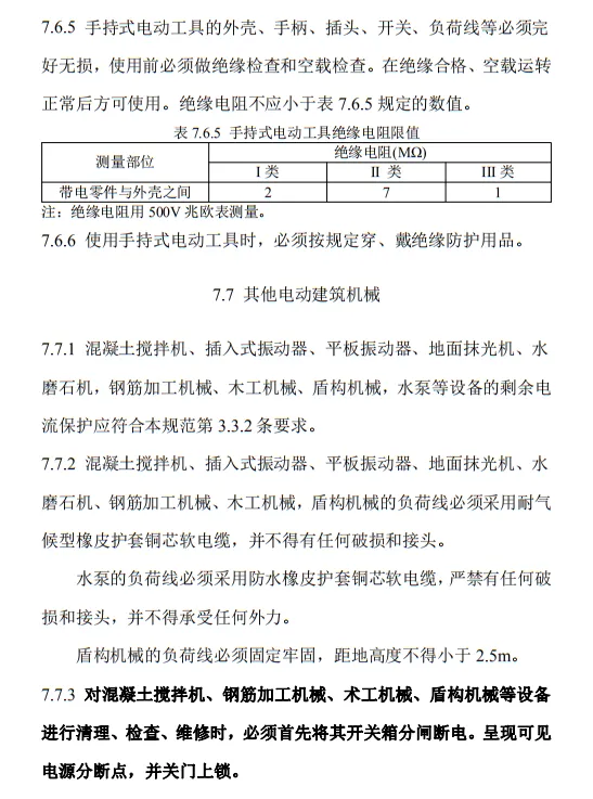 7.7.3 對混凝土攪拌機、鋼筋加工機械、術工機械、盾構機械等設備進行清理、檢查、維修時,必須首先將其開關箱分閘斷電。呈現可見電源分斷點,并關門上鎖。