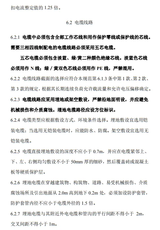6.2.1 電纜中必須包含全部工作芯線和用作保護零線或保護線的芯線。需要三相四線制配電的電纜線路必須采用五芯電纜。五芯電纜必須包含淡藍、綠/黃二種顏色絕緣芯線。淡藍色芯線必須用作N線;綠/黃雙色芯線必須用作PE線,嚴禁混用。