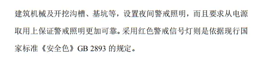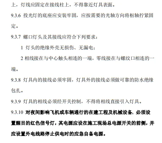 9.3.10 對夜間影響飛機或車輛通行的在建工程及機械設備, 必須設置醒目的紅色信號燈,其電源應設在施工現場總電源開關的前側,并應設置外電線路停止供電時的應急自備電源。