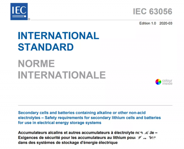 IEC 63056:2020規定了最高直流電壓為1500 V的電力儲能用二次鋰電池和電池組的安全要求和測試。IEC 63056:2020僅給出了電力儲能用二次鋰電池和電池組的附加或特殊要求,其基本安全要求在IEC 62619中規定。