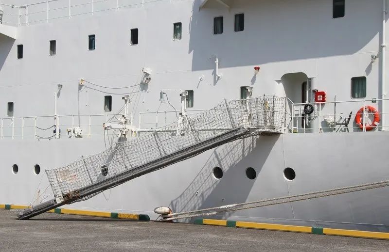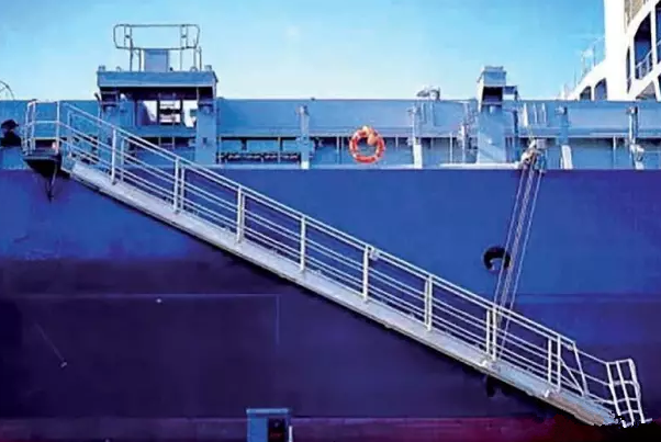 根據新生效的GB/T11701-2021《船用舷梯的基本規定》(3月1日起施行),舷梯主要分為兩類: (1)旋轉平臺式舷梯 單節舷梯、多節舷梯或伸縮舷梯的結構與上面的旋轉平臺鉸接,可在船與登梯底面之間改變方向和傾斜角度。舷梯可用鋼絲繩或鏈從較低的(各)懸掛點掛住,或用固定在舷梯底部滾柱支持。 (2)固定平臺式舷梯 單節舷梯、多節舷梯或伸縮舷梯的結構與上面的固定平臺鉸接,可在船和登梯底面之間改變傾斜角度。舷梯用鋼絲繩或鏈從較低的(各)懸掛點掛住,單獨使用的引航員舷梯采用此固定平臺式舷梯。 根據SOLAS第II-1章第3-9條款,凡是2010年1月1日及以后建造的船舶,必須在船上安裝經認可的登/離船設施,以備在港口或港口相關操作時使用。 該登/離船設施必須根據MSC.1/Circ.1331通函的要求進行建造、測試、安裝及維護,主要包括以下八點要求: (1)登/離船設施應遠離工作區域以及貨物或其它物體懸掛吊裝時可能通過上方的區域,該登/離船設施的目的和使用方式與引水員登 / 離船裝置是不同的; (2)應提供足夠的照明,以照亮登/離船設施、甲板上人員登/離船和裝置控制的位置; (3)當登/離船裝置在使用時,在其附近應備有一只帶有自亮浮燈和救生浮索的救生圈(注意這里是要求一只救生圈既配備有自亮浮燈又配備有救生浮索,并且處于隨時可用狀態); (4)每部舷梯應具有在其最大操作傾斜角時,下平臺在最輕載水線以上不大于600mm的高度; (5)在每部舷梯或跳板梯的兩端應設置一塊標記牌,以清楚顯示安全操作和負荷限制,包括最大和最小允許設計傾斜角、設計負荷、最大底端板負荷等,如果最大操作負荷小于設計負荷,則最大操作負荷也應顯示在標記牌上; (6)跳板梯使用時安放水平傾斜角不應大于30度和舷梯使用時水平傾斜角不應大于55度; (7)在人員從登/離船設施或船舶與碼頭之間可能墜落的舷梯下應安放安全網; (8)正確設置舷梯下平臺的安全插銷。 收放前:應對升降機械、鋼絲繩、滑車轉盤平臺支架等進行檢查,確認設備完好,鋼絲、卷筒、吊梁無障礙后方可作業。 收放過程中: (1)船靠離碼頭收放舷梯過程中,應有專人指揮,作業人員默契配合。在浮動的梯子上進行收起、安裝欄桿、護繩作業時,應先檢查平臺支架是否已可靠支好,并使用止蕩索,上舷梯操作人員必須系好安全帶,穿好救生衣。 (2)舷梯落岸下踏板應避開障礙物,安放平穩,嚴禁扭曲。吊梁、鏈條要注意絞高或安放妥當,以免碰頭和妨礙上下船。 (3)由于潮夕、裝卸貨、碼頭環境等因素影響,舷梯不能放置碼頭時,要注意隨時調整舷梯高度。當舷梯下踏板離碼頭較高較遠時,不允許勉強上下。梯口值班人員負責調整舷梯和提醒上下人員注意安全,必要時應按規定加裝橋梯。 (4)由于漲落潮、移泊等原因需要松緊纜繩時,應絞起舷梯,收起橋梯,或專人看好梯口禁止人員上下。在無法使用舷梯時,要正確地搭設橋梯,必須綁扎牢固、裝妥扶手、掛好安全網后人員方可上下。禁止從船舷直接跳上碼頭,或從碼頭直接跳上船。 (5)舷梯、橋梯必須按規定張掛安全網。舷梯、橋梯處應有防墜落、防滑等安全指示標志。舷梯、橋梯的扶手、扶繩、階梯必須保持清爽、干凈、牢固,便于上下人員抓牢、踏實。 (6)禁止用舷梯吊運物品,禁止超載。