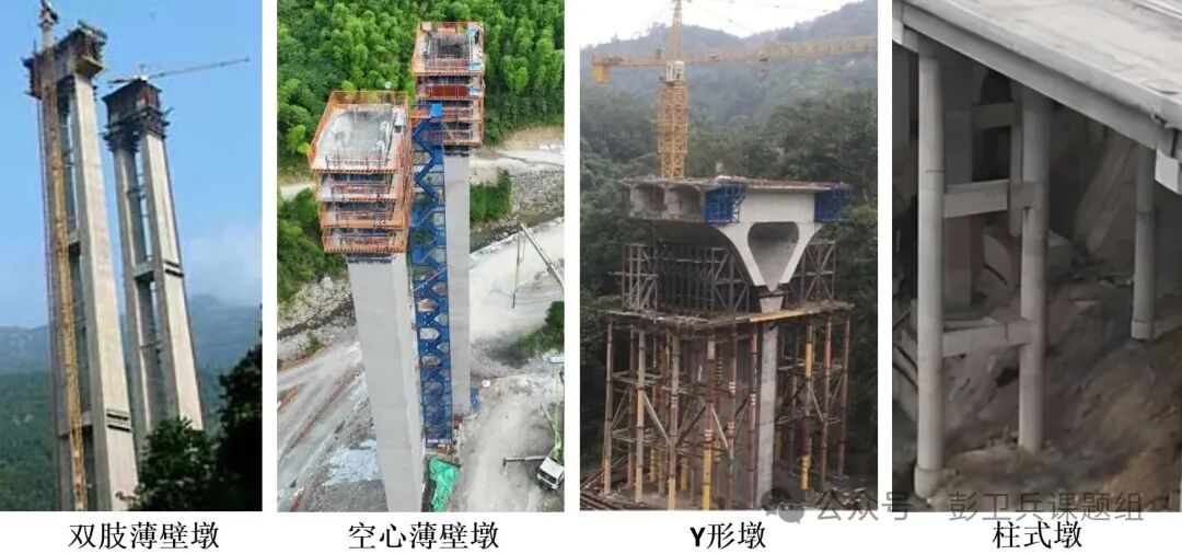 圖6 倒塌示意圖 50m跨徑的T梁,常采用先簡支后連續梁橋。從這次災害現場可以看出,先簡支后連續沒有引起一聯5跨的連續倒塌,與簡支梁的破壞模式類似。 事故發生時,貴州省南部、東南部地區遭遇的持續暴雨,部分鄉鎮甚至出現特大暴雨極端天氣,鄰近的榕江縣因持續強降雨及上游來水疊加,遭遇超30年一遇洪水。 對于山區橋梁,跨越較大溝谷時橋墩高差大,橋墩選型對抵抗地質災害有一定作用,常見橋墩形式主要為柱式墩、薄壁墩、空心墩和Y型墩等,如圖7所示。當墩高小于40m,柱式墩最為經濟,且工藝成熟,施工工期短;墩高在40-50m一般采用有較大剛度的實心薄壁墩;墩高大于50m多采用空心薄壁墩,雙肢薄壁墩。