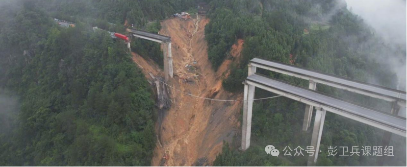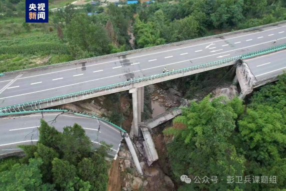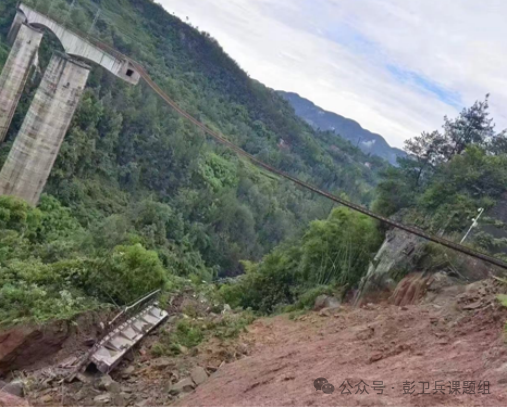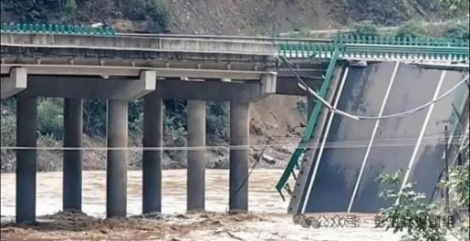 03 地質災害地區選線選型 山嶺重丘區地形起伏劇烈、坡度陡峭,不良地質作用(崩塌、滑坡、泥石流等)發育,洪水具有洪峰高、徑流量小、流速湍急及沖刷破壞性強等特征,路線布設應結合地形、地質及水文條件實現靈活布線。《北京市公路工程防洪設計指南》中指出,道路初步選線應優先避讓病害規模大、處治困難的不良地質區域,優先繞避滑坡頻發路段以及地質條件復雜、治理工程量大、處治困難的大型滑坡區域。然而,當路線必須穿越不良地質路段時,應避免高填深挖,減少對自然環境的擾動,降低誘發滑坡、泥石流等地質災害的風險。 從現有研究看,結構承載力計算具有一套完整的體系,在使用荷載和環境條件不變化的前提下,橋梁結構100年設計使用基準期內正常維護不需要大修就能滿足正常使用功能,而判斷山區是否發生滑坡概率相對具有較大的不確定性,因此地質災害、洪水和落石等可能成為控制橋梁在設計使用基準期內正常使用的控制條件。 盡管橋梁選線和優化結構設計(增大橋梁跨徑,避免在滑坡區域設置橋墩)在一定程度上可以減小滑坡引起橋墩倒塌的可能性,但將增大工程建設成本。根據交通運輸部2024年報,我國僅公路橋梁數量已經超過了110萬座,山區地質災害頻發的區域也建設了很多公路橋梁,完全靠提高設計標準來抵抗滑坡、泥石流和洪水等自然災害,成本過高,也很難完全杜絕類似事故。當然,近期由于氣候變化等因素,對于區域防洪標準乃至滑坡評估,可能需要重新評估。 04 類似災害引起的橋梁倒塌 (1)陜西丹寧高速(洪水導致橋梁倒塌) 2024年7月19日20時左右,陜西省商洛市柞水縣境內突發暴雨山洪,導致丹寧高速嚴坪村2號橋于局部垮塌,造成25輛車輛墜河,62人死亡失蹤。 圖8 陜西丹寧高速橋垮塌示意圖 (2)四川隧間橋(泥石流導致橋梁倒塌) 2024年8月3日凌晨,雅康高速公路康定至瀘定段日地1號隧道至2號隧道處,因突遇山洪泥石流導致隧間橋垮塌,造成4輛車墜河,10人失聯。 圖9 四川隧間橋倒塌示意圖 (3)重慶萬州駟步河鐵路橋(滑坡導致橋梁倒塌) 2023年7月4日上午,萬涼鐵路魚背山站至羅田站間,因連續強降雨引起山體滑坡,導致駟步河鐵路橋垮塌,未造成人員傷亡。 圖10 重慶萬州駟步河鐵路橋倒塌示意圖 (4)四川恩廣高速橋(落石導致橋梁倒塌) 2023年7月6日凌晨,G5012恩廣高速達萬段萬州至達州方向6號大橋周邊山體巖石突發崩塌,引起部分橋面坍塌。造成2車受損后自燃,3人受傷,無人員傷亡。