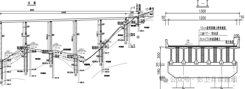 圖2 倒塌橋梁位置示意圖 根據相關資料,猴子河特大橋橋梁跨徑組成為3×50+(115+220+115)+5×50+25米,橋梁全長880.80m,結構整體立面情況如圖3所示。其中,滑坡導致橋梁倒塌處在8#~11#橋墩之間。此處,橋臺附近自然坡角為30~40°,局部地形起伏較大。 圖3 橋梁立面圖 滑坡處橋梁結構形式為5×50m預應力混凝土T梁(先簡支后連續),如圖4所示。下部結構為空心薄壁墩,此處最大橋墩高度在70m左右。