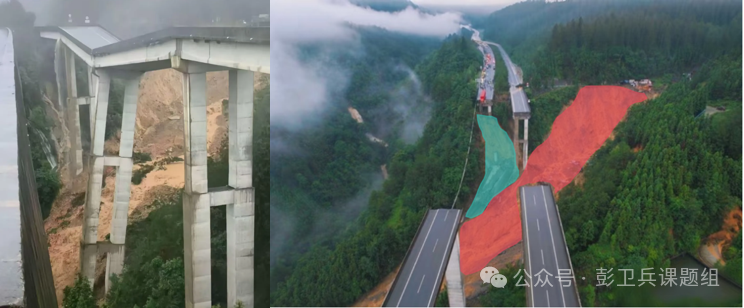 事故前后橋梁現場情況如圖6所示,從現有圖片與視頻資料可推斷,持續強降雨導致山體形成楔形剖面口發生滑坡,左幅橋梁墩底受推力傾斜使得樁基剪斷而引起引橋整體變形,最終導致左幅引橋垮塌;右幅橋梁則因左幅垮塌及滑坡推力的雙重作用整體坍塌,現場可見左幅橋梁坍塌兩跨、右幅坍塌三跨,大部分構件沖至山谷下方。梁橋橋墩無法抵抗滑坡的巨大橫向推力,橋墩失效后,導致部分橋跨主梁相應損毀。具體而言,圖6中紅色區域橋梁橫向"大滑坡"引發左幅引橋兩跨坍塌,同時橋梁縱向綠色區域"小滑坡"加劇了對右幅引橋的破壞,最終造成右幅三跨坍塌。