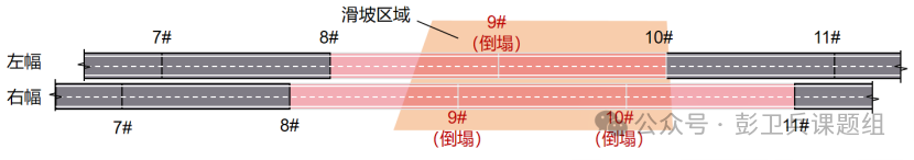 圖4 橋梁結構示意圖 滑坡造成左幅9#橋墩破壞,8#~10#墩間主梁掉落;右幅9#和10#橋墩破壞,8#~11#墩間主梁掉落。具體破壞情況如圖5所示。