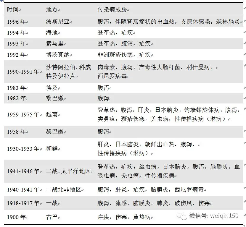 美軍歷次戰爭中爆發的傳染病及遭遇的生物恐怖襲擊 傳染病一直威脅著美軍的軍事行動。美軍隨時準備部署到世界的任何地方,無論是為了實戰或是演習及維和,都有可能被派遣到傳染病高危地區。美軍在氣候、生態、人口完全不同的環境中可能接觸到以前在本土從未感染過的疾病。最近10年,美軍的足跡遍布加勒比,中東,中南亞及西太平洋,阿富汗,菲律賓等地區。自1900年起,美軍歷次海外戰爭中所遇到的傳染性疾病見附表。