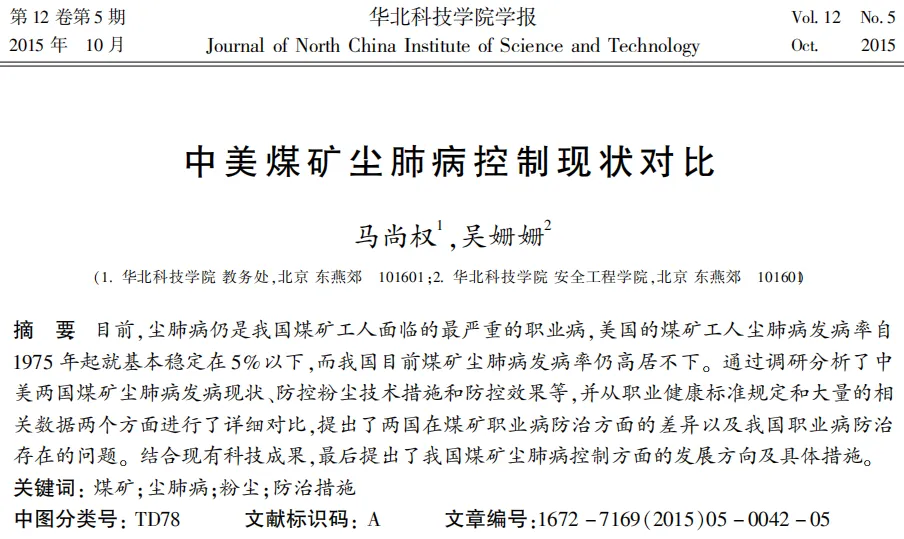 華北科技學院馬尚權、吳珊珊兩位老師2015年10月發表在《華北科技學院學報》上的論文“中美煤礦塵肺病控制現狀對比”,較系統的描述了中美在煤工塵肺病預防控制方面的差異。