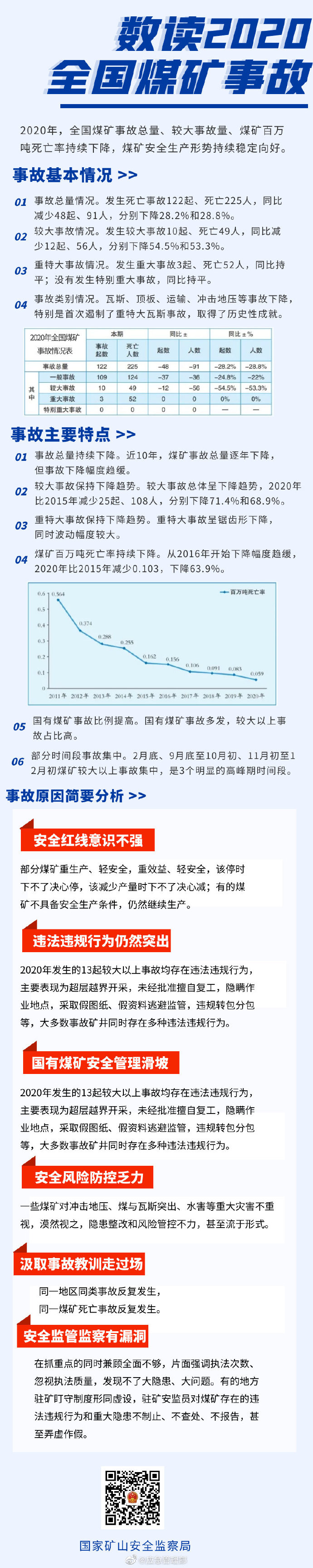2020年,面對極其嚴峻復雜的國內外形勢,特別是新冠肺炎疫情的嚴重沖擊,在黨中央、國務院的堅強領導下,各地區、各有關部門和廣大煤礦企業統籌抓好疫情防控和安全生產工作,全國煤礦事故總量、較大事故量、煤礦百萬噸死亡率持續下降,煤礦安全生產形勢持續穩定向好。