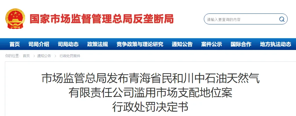 青海省市場監督管理局于2018年5月對青海省民和川中石油天然氣有限責任公司涉嫌濫用市場支配地位實施壟斷行為立案調查。2020年5月,青海省市場監督管理局對本案作出行政處罰決定。現將行政處罰決定書予以公告。
