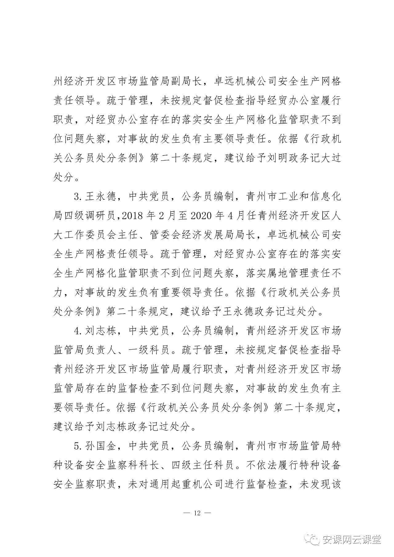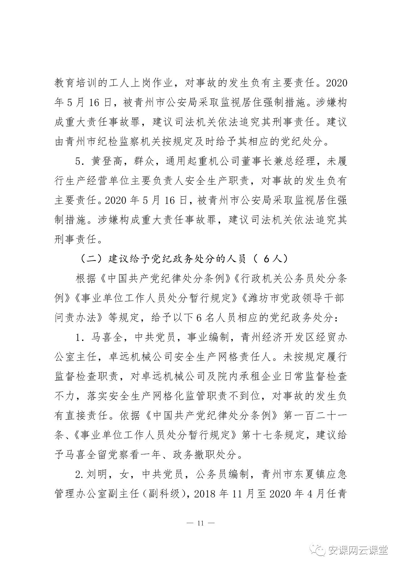 2020年5 月16 日,被青州市公安局采取監視居住強制措施。涉嫌構成重大責任事故罪,建議司法機關依法追究其刑事責任。建議由青州市紀檢監察機關按規定及時給予其相應的黨紀處分。