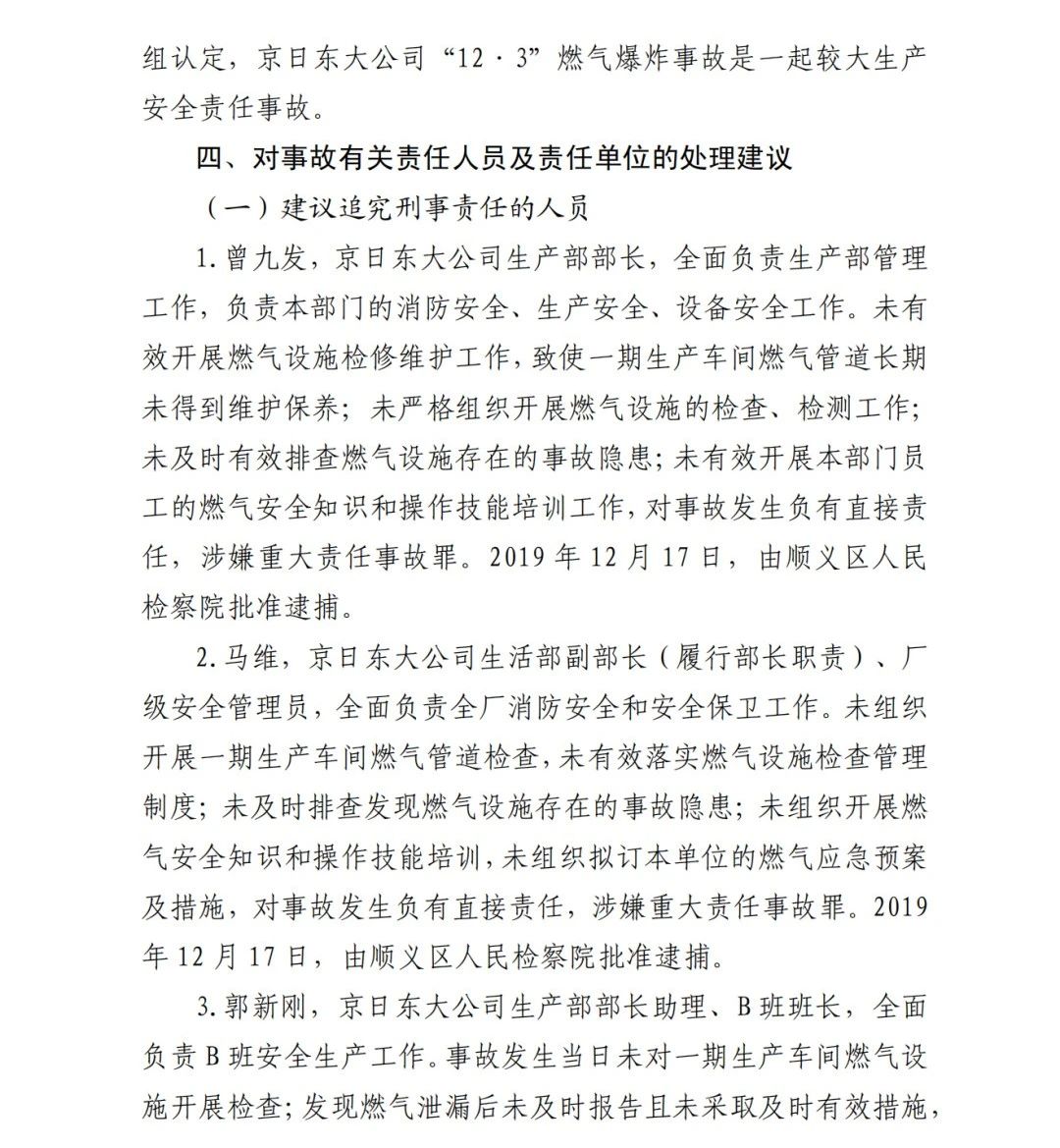 1.曾九發(fā),京日東大公司生產(chǎn)部部長(zhǎng),全面負(fù)責(zé)生產(chǎn)部管理工作,負(fù)責(zé)本部門的消防安全、生產(chǎn)安全、設(shè)備安全工作。未有效開(kāi)展燃?xì)庠O(shè)施檢修維護(hù)工作,致使一期生產(chǎn)車間燃?xì)夤艿篱L(zhǎng)期未得到維護(hù)保養(yǎng);未嚴(yán)格組織開(kāi)展燃?xì)庠O(shè)施的檢查、檢測(cè)工作;未及時(shí)有效排查燃?xì)庠O(shè)施存在的事故隱患;未有效開(kāi)展本部門員工的燃?xì)獍踩R(shí)和操作技能培訓(xùn)工作,對(duì)事故發(fā)生負(fù)有直接責(zé)任,涉嫌重大責(zé)任事故罪。2019 年 12 月 17 日,由順義區(qū)人民 檢察院批準(zhǔn)逮捕。