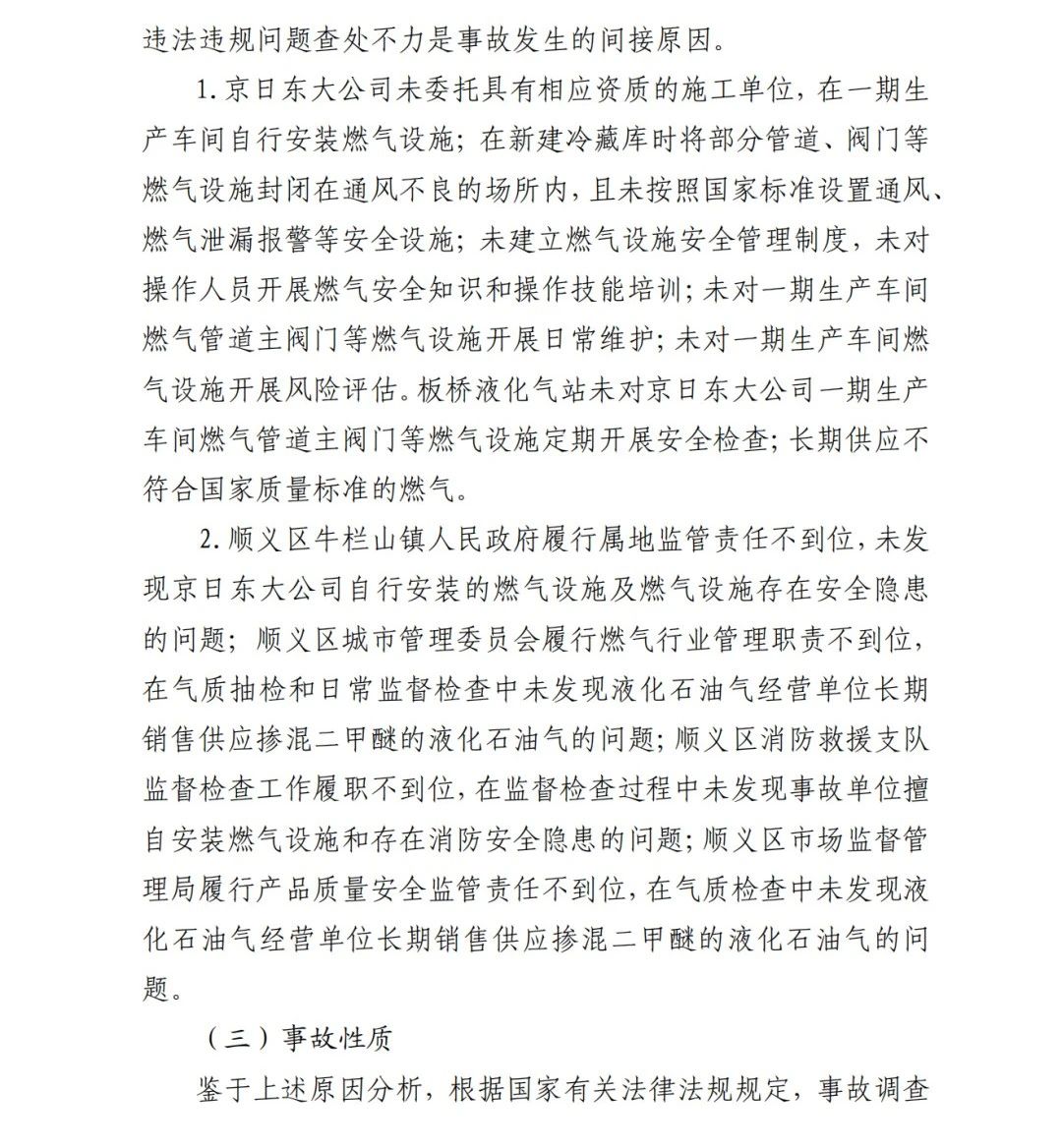 事故調(diào)查報(bào)告顯示:方勇忠2006年負(fù)責(zé)京日東大公司一期生產(chǎn)車間建設(shè)工作,期間未委托具有相應(yīng)資質(zhì)的施工單位,而組織本單位人員自行建設(shè)安裝燃?xì)庠O(shè)施,導(dǎo)致燃?xì)庠O(shè)施安全隱患長(zhǎng)期存在。另外,方勇忠2018年負(fù)責(zé)一期生產(chǎn)車間內(nèi)新建冷藏庫(kù)建設(shè),將部分管道、閥門等燃?xì)庠O(shè)施封閉在通風(fēng)不良的場(chǎng)所內(nèi),且未設(shè)置通風(fēng)、燃?xì)庑孤﹫?bào)警等安全設(shè)施,因而對(duì)事故發(fā)生負(fù)有直接責(zé)任。