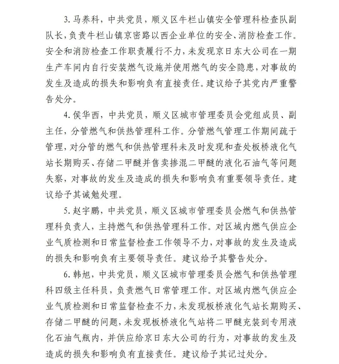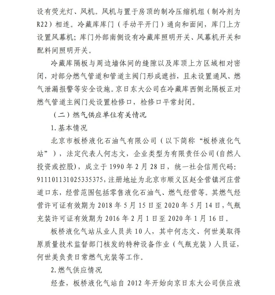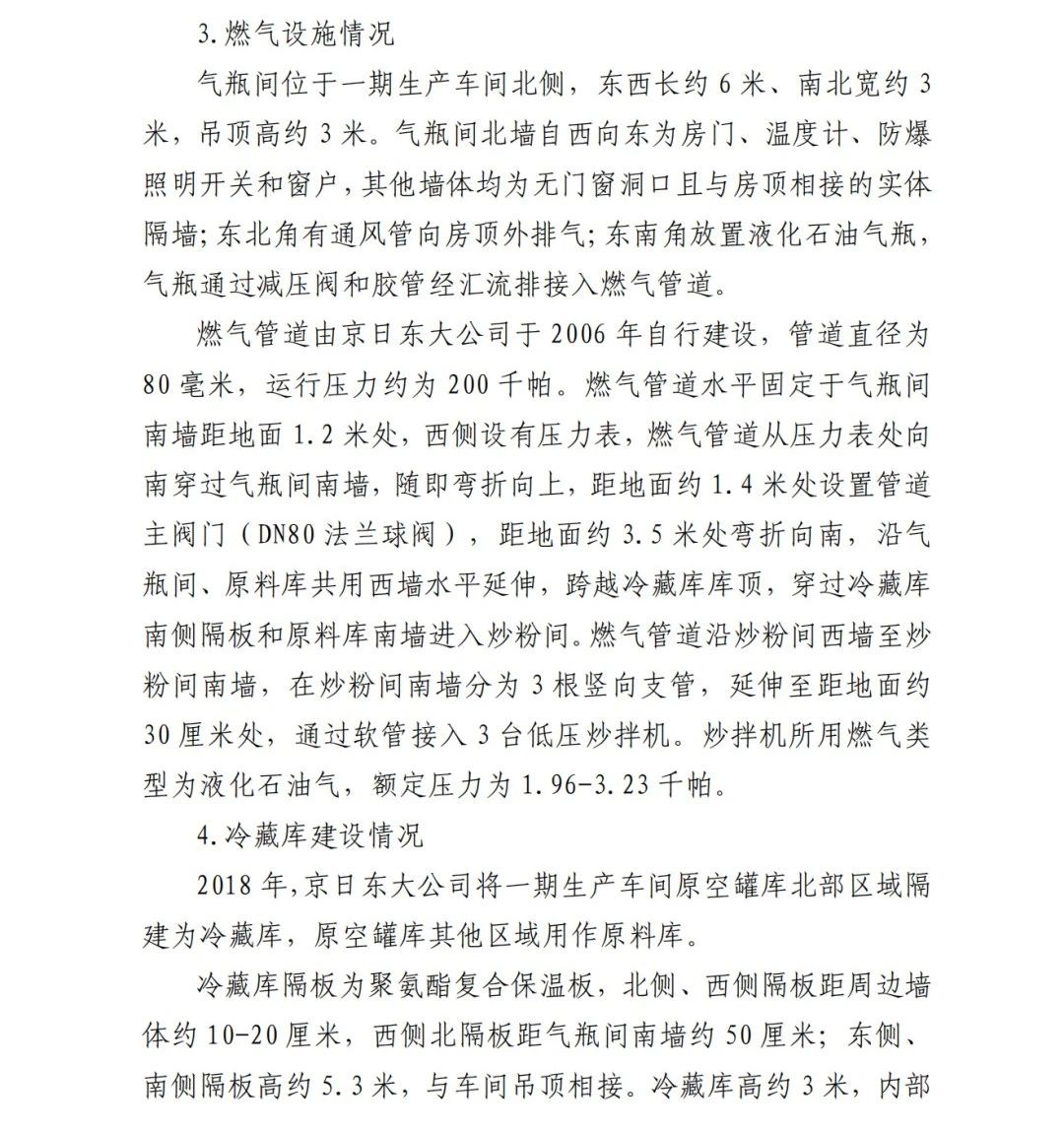 4.方勇忠,曾先后擔(dān)任京日東大公司生活部副部長(zhǎng)兼設(shè)備部部長(zhǎng)助理、設(shè)備部部長(zhǎng)、生產(chǎn)部部長(zhǎng)兼設(shè)備部部長(zhǎng)、總經(jīng)理助理(2019年4月辭職)。2006年負(fù)責(zé)京日東大公司一期生產(chǎn)車間建設(shè)工作,期間未委托具有相應(yīng)資質(zhì)的施工單位,組織本單位人員自行建設(shè)安裝燃?xì)庠O(shè)施,導(dǎo)致燃?xì)庠O(shè)施安全隱患長(zhǎng)期存在;2018 年負(fù)責(zé)一期生產(chǎn)車間內(nèi)新建冷藏庫(kù)建設(shè),將部分管道、閥門等燃?xì)庠O(shè)施封閉在通風(fēng)不良的場(chǎng)所內(nèi),且未設(shè)置通風(fēng)、燃?xì)庑孤﹫?bào)警等安全設(shè)施,對(duì)事故發(fā)生負(fù)有直接責(zé)任,涉嫌重大責(zé)任事 故罪。2020 年 1 月 23 日被順義公安分局刑事拘留,2 月 6 日取 保候?qū)彛ㄗh依法追究刑事責(zé)任。