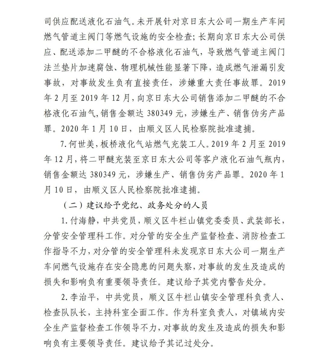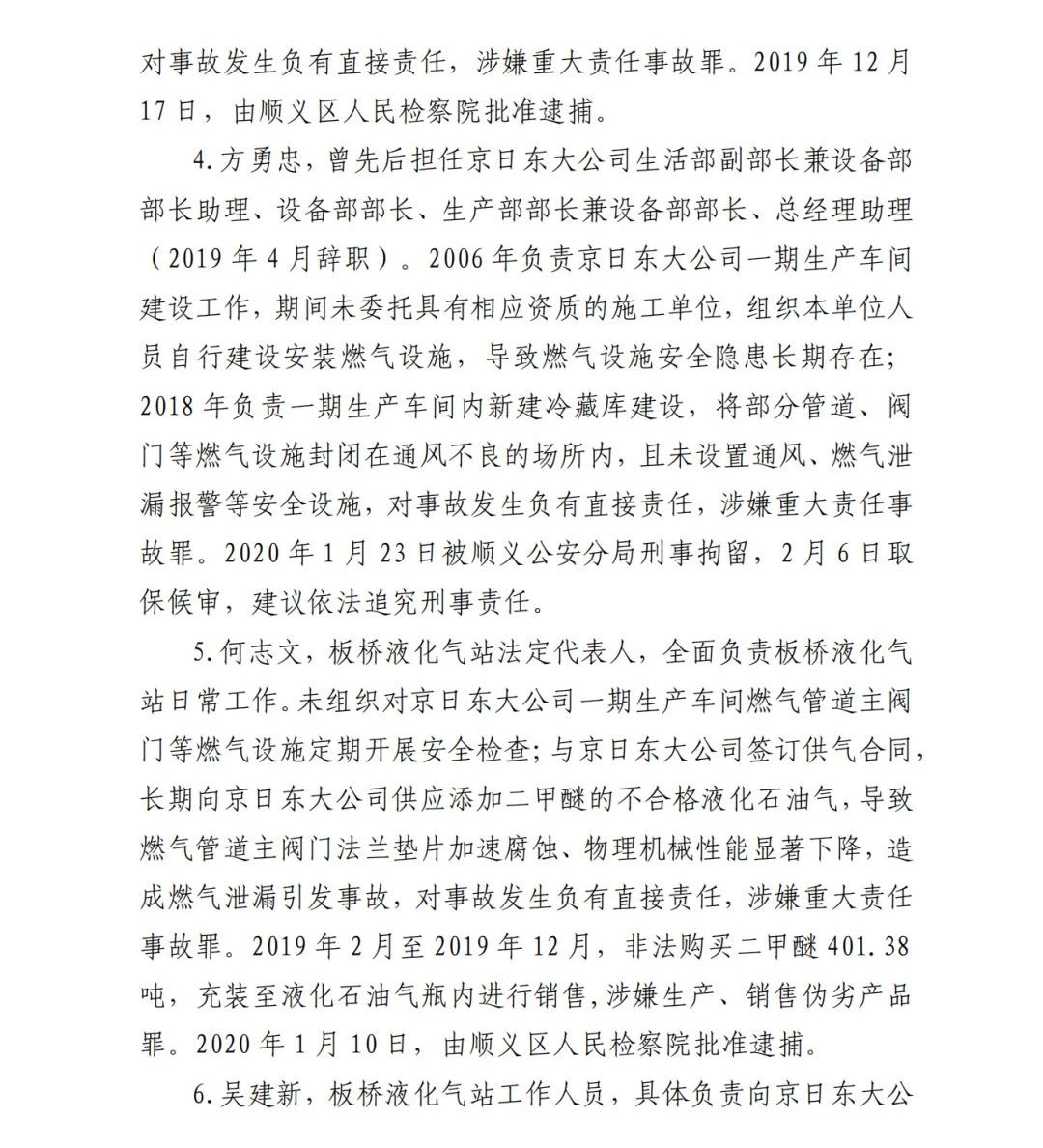 6.吳建新,板橋液化氣站工作人員,具體負(fù)責(zé)向京日東大公15司供應(yīng)配送液化石油氣。未開(kāi)展針對(duì)京日東大公司一期生產(chǎn)車間燃?xì)夤艿乐鏖y門等燃?xì)庠O(shè)施的安全檢查;長(zhǎng)期向京日東大公司供應(yīng)、配送添加二甲醚的不合格液化石油氣,導(dǎo)致燃?xì)夤艿乐鏖y門法蘭墊片加速腐蝕、物理機(jī)械性能顯著下降,造成燃?xì)庑孤┮l(fā) 事故,對(duì)事故發(fā)生負(fù)有直接責(zé)任,涉嫌重大責(zé)任事故罪。2019 年 2 月至 2019 年 12 月,向京日東大公司銷售添加二甲醚的不合 格液化石油氣,銷售金額達(dá) 380349 元,涉嫌生產(chǎn)、銷售偽劣產(chǎn)品 罪。2020 年 1 月 10 日,由順義區(qū)人民檢察院批準(zhǔn)逮捕。
