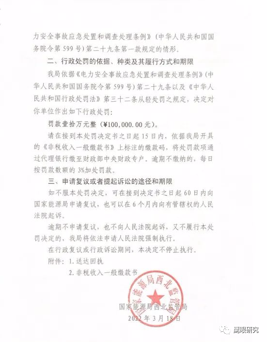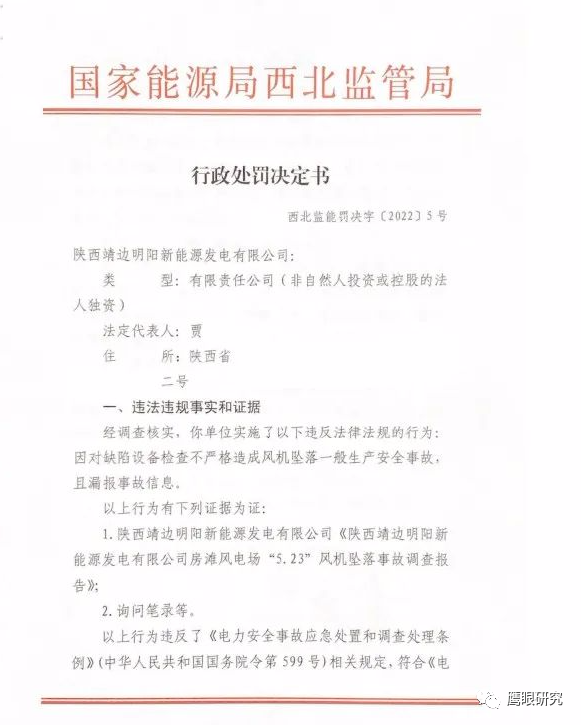 3月18日,國家能源局西北監(jiān)管局發(fā)布對陜西靖邊明陽新能源發(fā)電有限公司的行政處罰決定書(西北監(jiān)能罰決字〔2022〕5號),該公司因對缺陷設備檢查不嚴格造成風機墜落一般生產安全事故,且漏報事故信息,對其作出罰款10萬元的決定。