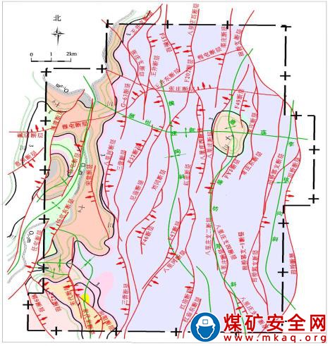 山東龍鄆煤業有限公司前身為山東省鄆城煤礦,位于菏澤市鄆城縣潘渡鎮境內,南距鄆城縣城 6 千米。原隸屬于山東省齊魯新航集團有限責任公司,2006 年 9 月開工建設。2011 年 1 月起,山東省鄆城煤礦由龍礦集團托管。2016 年 6 月,龍礦集團與山東省齊魯新航集團有限責任公司簽訂了《山東省鄆城煤礦移交接管劃轉協議》,礦井的生產建設主體變更為龍礦集團。2017 年 4 月,礦井正式投產,設計生產能力 240 萬噸/年。2017 年 12 月,礦井更名為山東龍鄆煤業有限公司(以下簡稱龍鄆煤礦)。2017 年 5~12 月,生產原煤 160 萬噸;2018 年 1~9 月,生產原煤 177.73萬噸。礦井采礦許可證、安全生產許可證、工商營業執照齊全有效。礦井開采條件。井田位于巨野煤田最北端,屬全隱蔽的華北型石炭、二疊系煤田。井田范圍由 20 個拐點坐標圈定,面積 198.3 平方公里,開采標高-450~-1750 米。井田含煤地層為山西組和太原組,其中主采煤層為山西組 3 煤層。井田處于鄆城斷裂、巨野斷裂、曹縣斷裂和汶泗斷裂的“井”字形中間區內,井田的典型構造特征為斷塊型。井田總體呈走向近南北、傾向東的單斜構造,勘查發現全井田共有斷層 130 條,其中,一采區 37 條。見圖 1。