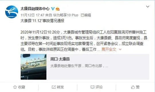 2020年11月12日10:26分,太康縣城市管理局組織工人在陽夏路渦河橋窨井施工時,發生意外事故,造成3死1傷。事故發生后,太康縣委、縣政府高度重視,縣主要領導在第一時間赴事故現場實地察看情況,召開緊急會議,成立聯合調查組。目前,事故詳細原因正在調查中,善后工作也在同步進行。據大象新聞(河南廣播電視臺主辦)報道,污水提泵站損壞,2名施工人員下井檢修時觸電,另外2名施工人員下井施救也不幸觸電。