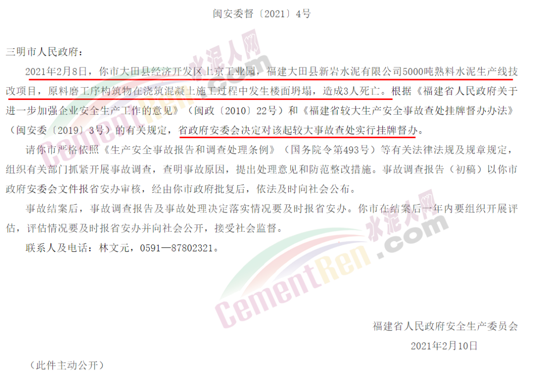 據(jù)水泥人網(wǎng)了解,福建省應(yīng)急管理廳發(fā)布較大生產(chǎn)安全事故查處掛牌督辦通知書(三明大田2.8水泥技改項(xiàng)目施工過程樓面坍塌事故)稱,2021年2月8日,三明市大田縣經(jīng)濟(jì)開發(fā)區(qū)上京工業(yè)園,福建大田縣新巖水泥有限公司5000噸熟料水泥生產(chǎn)線技改項(xiàng)目,原料磨工序構(gòu)筑物在澆筑混凝土施工過程中發(fā)生樓面坍塌,造成3人死亡。 依據(jù)有關(guān)規(guī)定,福建省政府安委會決定對該起較大事故查處實(shí)行掛牌督辦。