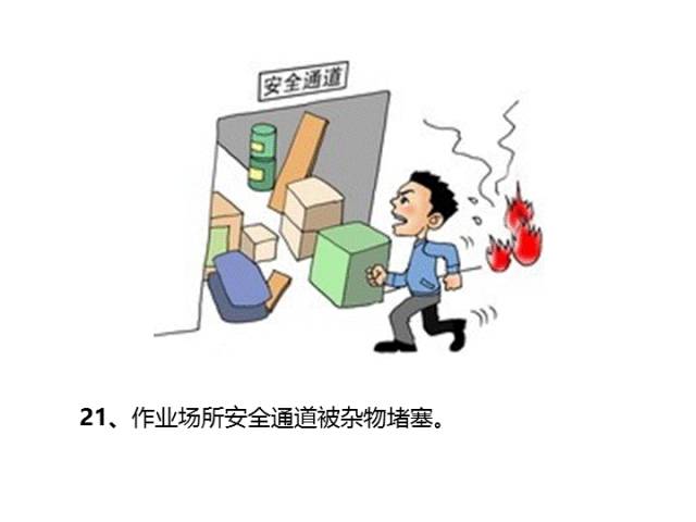 一、操作失誤、忽視安全、忽視警告 二、造成安全裝置失效 三、不安全的使用設備 四、用手替代工具操作 五、物體存放不當 六、冒險進入危險場所 七、處于不安全的位置 八、在起吊物下停留、作業 九、機械運轉時加油、修理、檢查、調整、焊掃等 十、分散注意力的行為 十一、忽視實用個人防護用具 十二、不安全裝束 十三、對易燃易爆等危險品處理錯誤