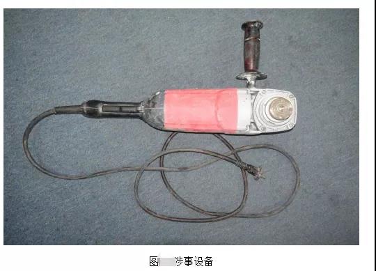 涉事設備產品名稱為角向磨光機,所有人:彭小共,型號:S1M-HL02B-180,電源電壓:220V-50Hz,額定空載轉速:8400r/min,功率:2600W,砂輪外徑:φ180mm,生產單位:蘇州聚匠人五金工具有限公司,銘牌處還有閱讀說明書提示標識和佩戴護目鏡提示標識,測得涉事設備的砂輪片安裝軸直徑為φ25.4mm。涉事設備的前端部位為金屬材質,其余部位均為塑料材質。