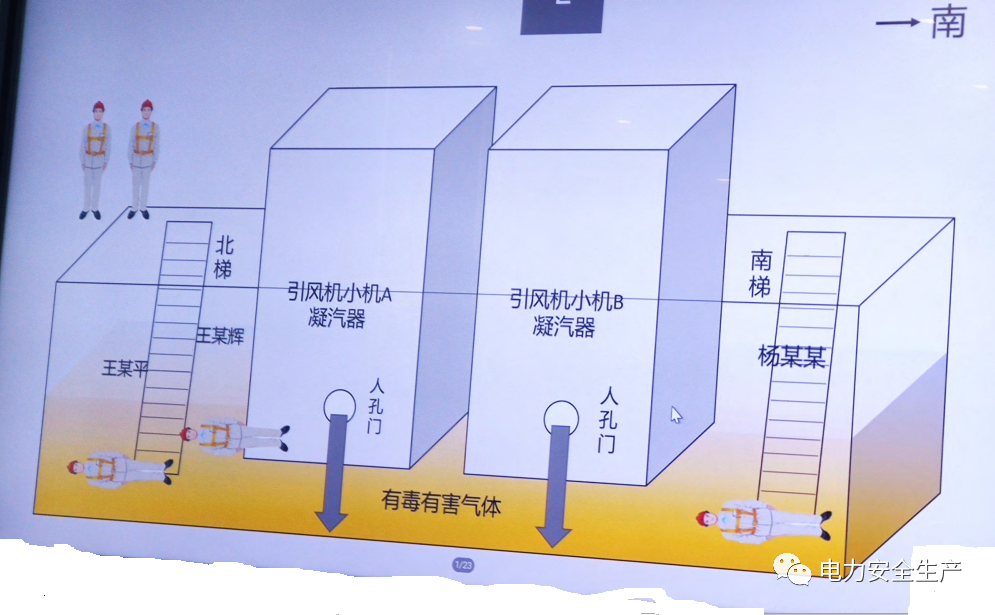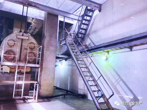 15:40安潔公司楊某某等4名作業人員,從#4機組汽動引風機室北側鋼步梯依次走下凝汽器區域準備清理垃圾及取回相關工具,走在前面的王某某、王某某在下樓梯半途中暈倒并滑落至樓梯底部,走在后面的楊某某、王某某發現情況異常,隨即退至汽動引風機室外,并電話報告檢修部鄭某某。