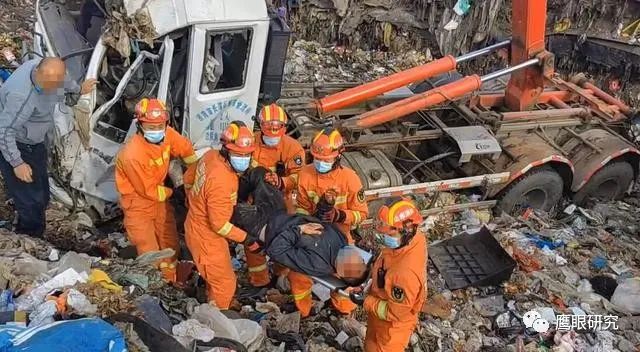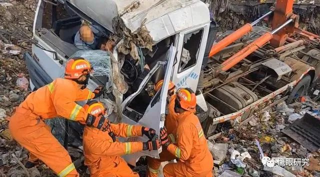 消防救援人員通過電話詢問現(xiàn)場報警人了解到,該垃圾車在卸載垃圾時抬升過高,導致滑入垃圾池內(nèi)側翻,有1名人員被困。
