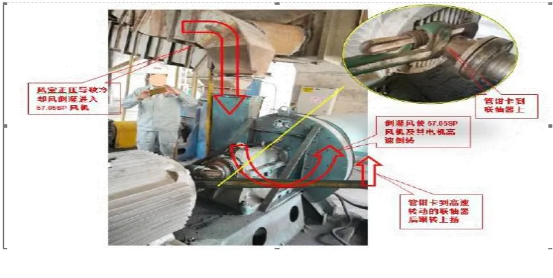 篦冷機冷卻風機因風路之間相互竄通,風路回竄致使停機風機葉輪倒轉。