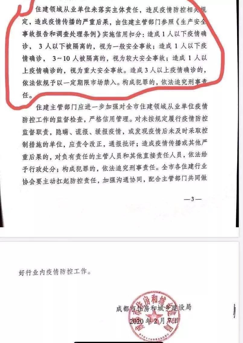 2月7日,成都市住房和城鄉建設局發布了《關于將新型冠狀病毒感染的肺炎疫情防控工作納入住建領域市場主體信用評價管理的通知》。