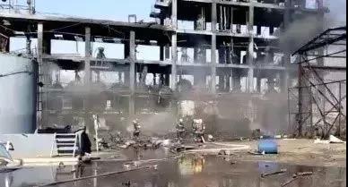 事故引發多次爆炸,造成車間中部至東部嚴重過火,車間西部框架部分損壞,二層、三層空心磚砌體全部崩出,三層樓板及樓頂變形嚴重,車間北側30米處的控制室、維修間南墻倒塌,車間西側50余米外辦公生活區內的辦公樓、倒班宿舍樓門窗玻璃全部損壞,車間南側80米處的倉庫輕質房頂嚴重受損。經計算,本次事故的總爆炸當量約為1.32tTNT。