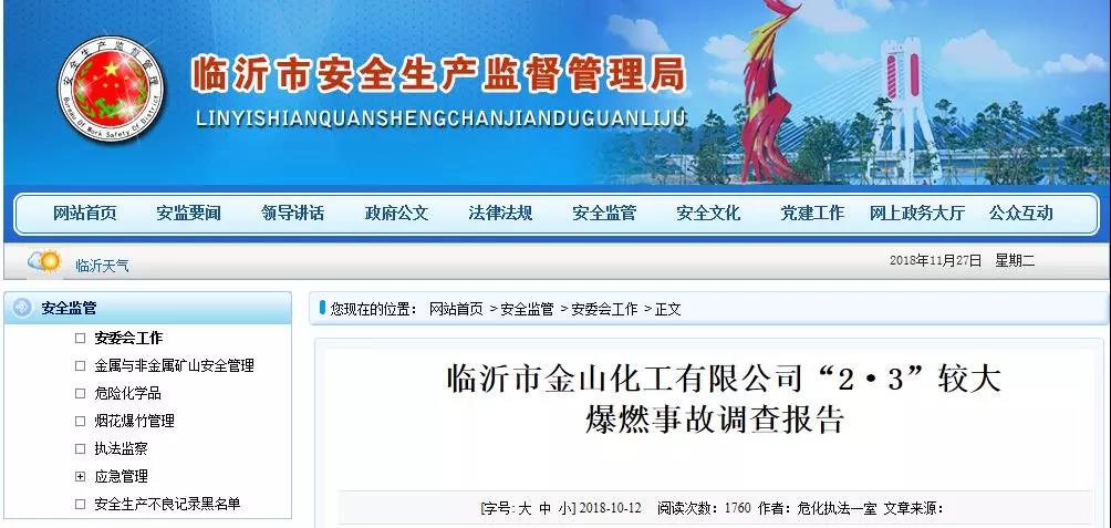 經調查認定,臨沂市金山化工有限公司“2.3”爆燃事故是一起較大生產安全責任事故。