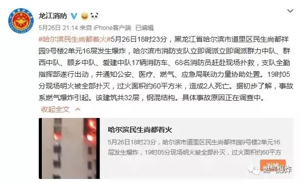 據(jù)@龍江消防:#哈爾濱民生尚都著火#5月26日18時23分,黑龍江省哈爾濱市道里區(qū)民生尚都祥園9號樓2單元16層發(fā)生爆炸,哈爾濱市消防支隊(duì)立即調(diào)派立即調(diào)派群力中隊(duì)、群西中隊(duì)、顧?quán)l(xiāng)中隊(duì)、愛建中隊(duì)17輛消防車、68名消防員趕赴現(xiàn)場撲救,支隊(duì)全勤指揮部遂行出動,并通知公安、醫(yī)療、燃?xì)狻?yīng)急局聯(lián)動力量協(xié)助處置。19時05分現(xiàn)場明火被全部撲滅,過火面積約60平方米,造成2人死亡。據(jù)初步了解,事故系燃?xì)獗ㄒ稹T摻ㄖ?2層,鋼混結(jié)構(gòu)。