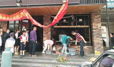 臨街對門的一家店鋪經營者告訴記者,事發時,聽到院子里動靜比較大,他趕緊出來察看,發現餐館的櫥窗已經飛出去了?!暗觊T口停著兩輛車,行人繞著車走,飛出來的玻璃砸在車上,沒有傷到路人。事故發生時,正好餐館下午休息,店里沒有消費者,員工也下班了,未造成人員傷亡。”