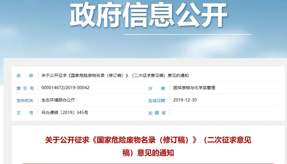 關于公開征求《國家危險廢物名錄(修訂稿)》(二次征求意見稿)意見的通知