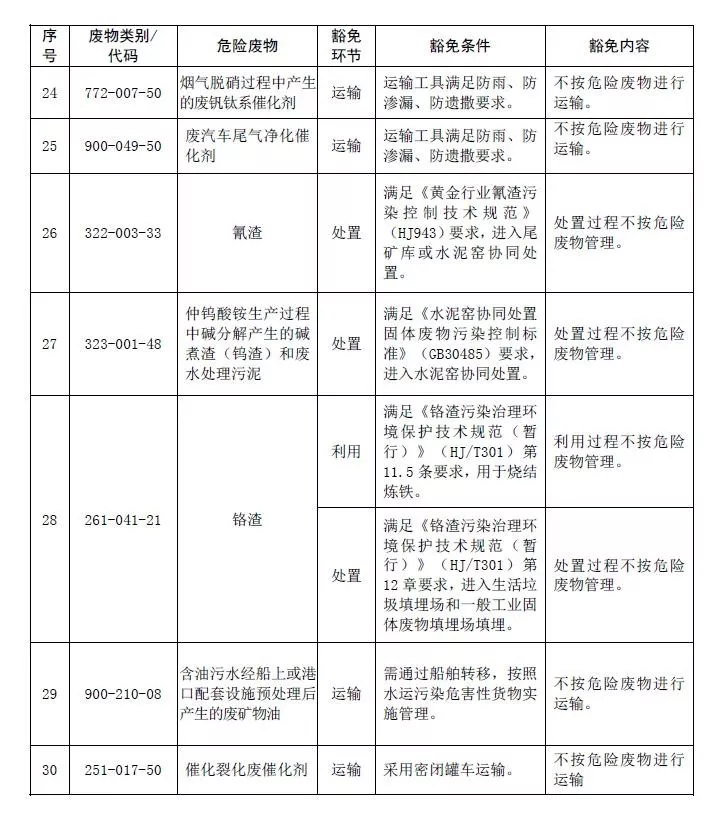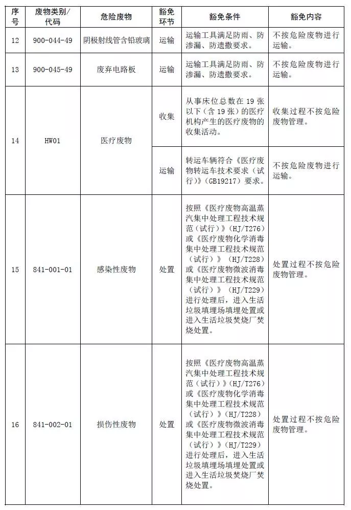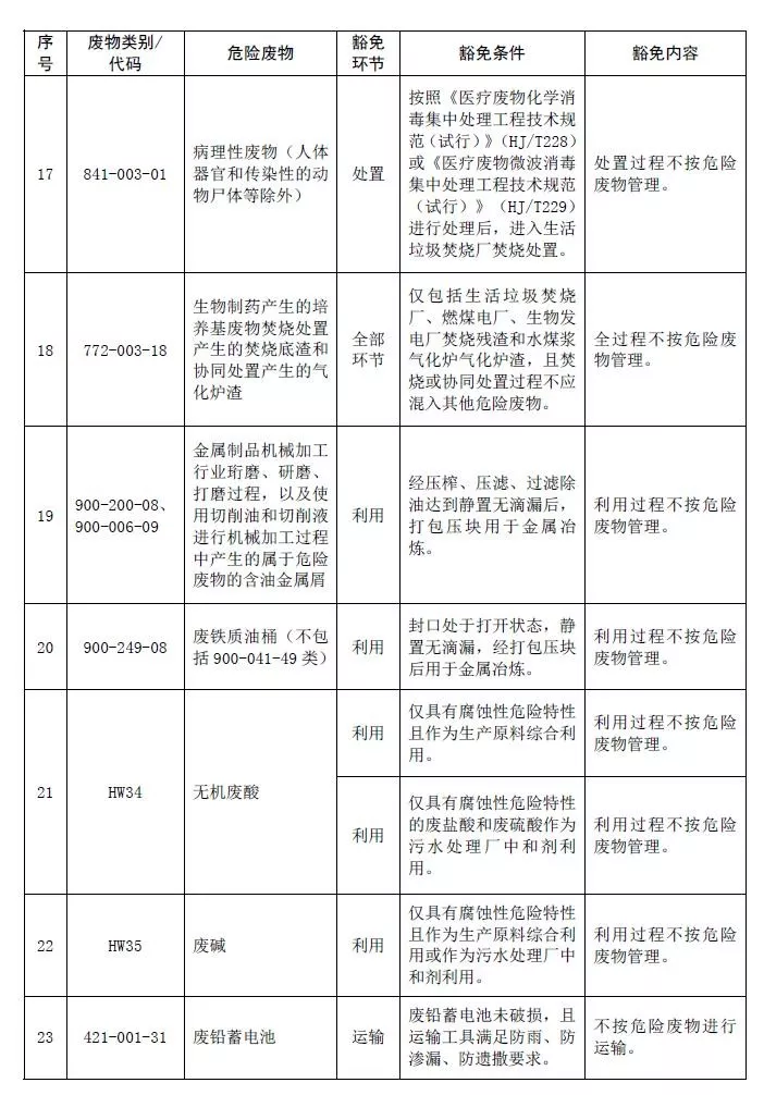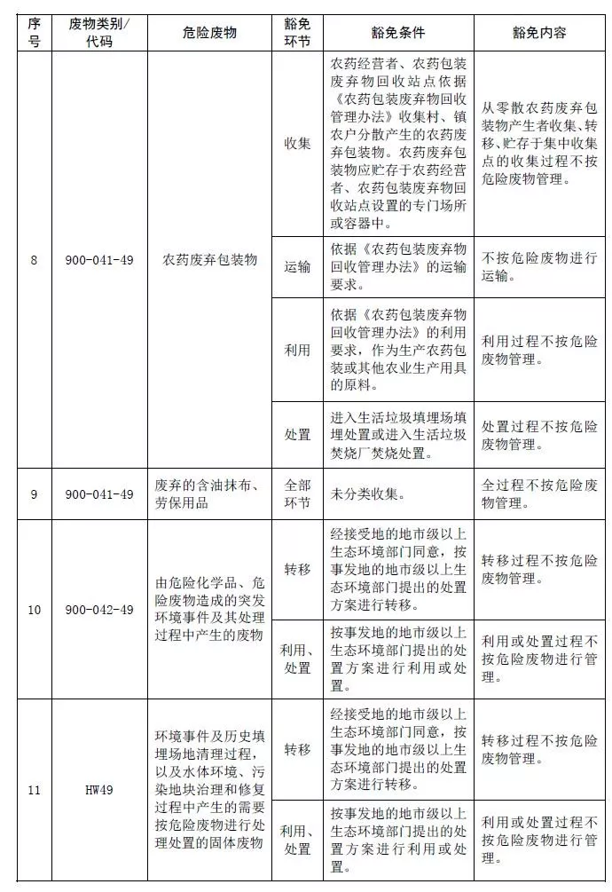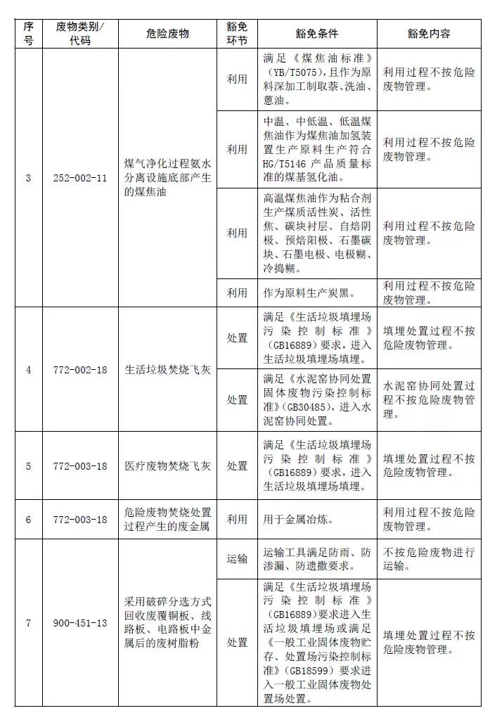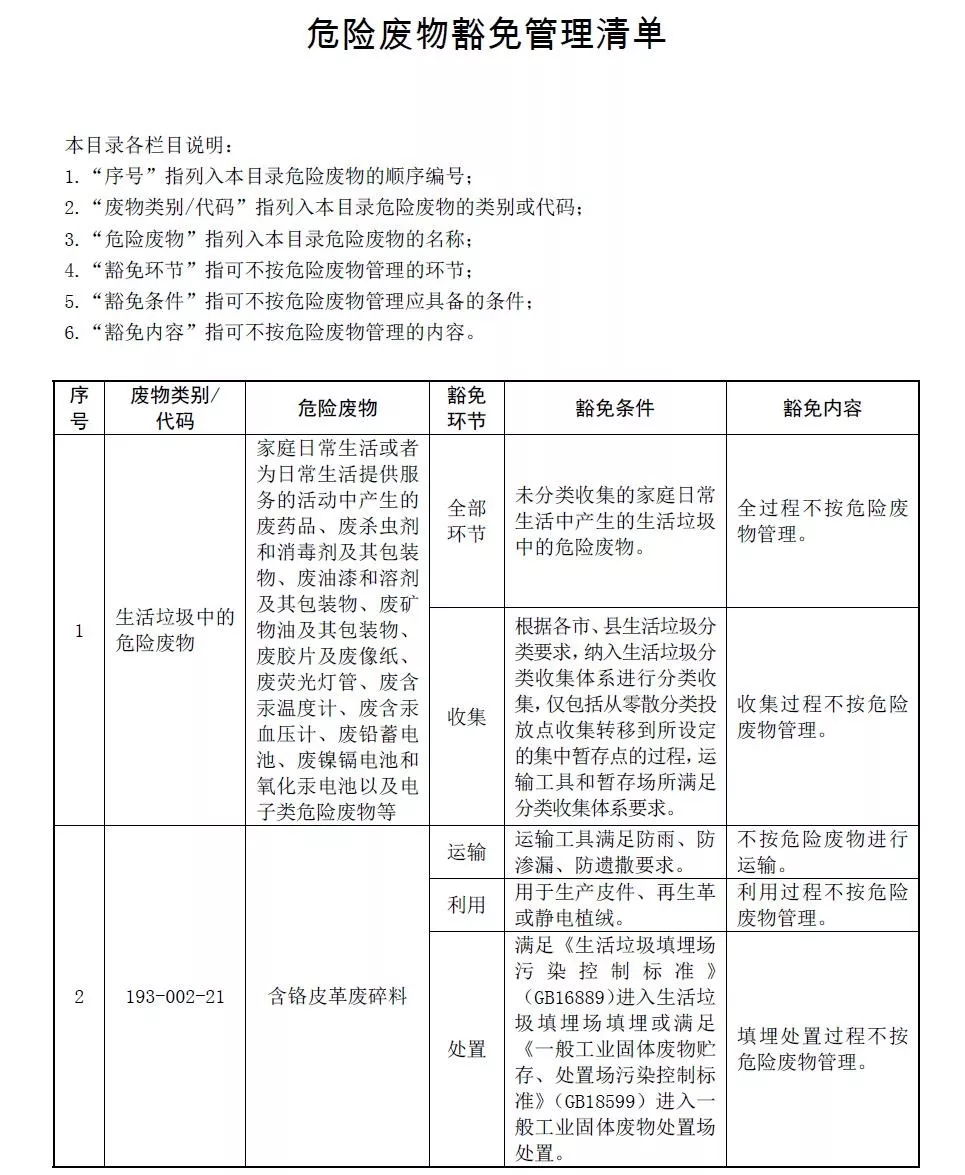 1.修改廢棄危險化學品管理屬性規定。2016 年版《名錄》將廢棄危險化學品列入《名錄》,實施過程發現,廢棄危險化學品不能簡單等同于危險廢物,例如液氮。一是刪除2016 年版《名錄》正文第四條“列入《危險化學品目錄》的化學品廢棄后屬于危險廢物”;二是將附表《國家危險廢物名錄》中“900-999-49”類危險廢物的表述修改為“所有者申報廢棄的危險化學品,以及有關部門依法收繳或接收且需要銷毀的危險化學品”。從管理環節和監管職責交接上明確了廢棄危險化學品和危險廢物的界限。2.修改生活垃圾中危險廢物豁免管理規定。隨著我國《生活垃圾分類制度實施方案》的頒布,以及“無廢城市”建設工作的推進,我國大部分城市將實行生活垃圾強制分類。根據目前我國生活垃圾分類試點工作實際情況,修訂了生活垃圾中危險廢物收集過程的豁免條件,為相關部門開展生活垃圾中危險廢物的分類收集活動消除管理制度的障礙。3.修改農藥包裝廢棄物回收過程豁免管理規定。本次修訂對農藥包裝廢棄物收集、運輸、利用和處置環節實施有條件豁免管理,農藥包裝廢棄物回收管理辦法》的相關規定在《危險廢物豁管理清單》中體現。4.修改煤焦化相關危險廢物的規定。針對該類廢物重點從兩個方面進行修改:一是重新梳理并明確了煤焦化過程產生的各類危險廢物及其工藝來源;二是根據不同煤焦油的利用途徑,在《危險廢物豁免管理清單》中增加當煤焦油用于生產煤基氫化油、碳素材料、炭黑時,滿足一定條件利用過程可不按危險廢物管理的規定。5.修改銅、鉛、鋅冶煉相關危險廢物的規定。2016 年版《名錄》對銅、鉛、鋅等有色金屬冶煉過程產生的危險廢物類型及工藝描述不清,本次修訂過程中對該類廢物開展了專項調查研究,重新梳理并細化了銅、鉛、鋅冶煉過程產生的危險廢物種類及其工藝來源和危險特性。6.修改鋁冶煉相關危險廢物的規定。2016 年版《名錄》對鋁冶煉過程產生的危險廢物類型及產生工藝描述不清,本次修訂過程中對鋁冶煉過程中產生的危險廢物進行了重新梳理,調查分析了其危險特性,明確了鋁冶煉過程產生的危險廢物種類及其工藝來源和危險特性。7.明確部分類別廢物的涵蓋范圍。2016 年版《名錄》中對樹脂、乳膠、增塑劑生產過程中產生的危險廢物的界定不清晰,導致涵蓋范圍過大。實際調研發現不同來源的上述廢物危險特性存在較大的差異。根據危險特性調查結果,本次修訂將其中危險特性較小、環境風險可控的廢物從《名錄》中刪除。8.刪除為防治動物傳染病而需要收集和處置的廢物。2016 年版《名錄》將“為防治動物傳染病而需要收集和處置的廢物”列為900-001-01 類危險廢物,而動物防疫法明確要求該類廢物應當按照國務院獸醫主管部門的規定進行無害化處理, 本次修訂將900-001-01 類危險廢物刪除。9.明確《名錄》附表中危險特性代碼的含義。2016 年版《名錄》未對附表中所列危險特性代碼的含義作出明確解釋,可能導致相關污染控制標準實施困難。本次修訂,一是明確《名錄》附表中所列危險特性代碼為該種危險廢物的主要危險特性,同時不排除可能具有其他危險特性;二是統一了危險特性代碼的格式和含義。10.根據最新《國民經濟行業分類》(GB/T 4754-2017),更新了《名錄》附表中廢物代碼。