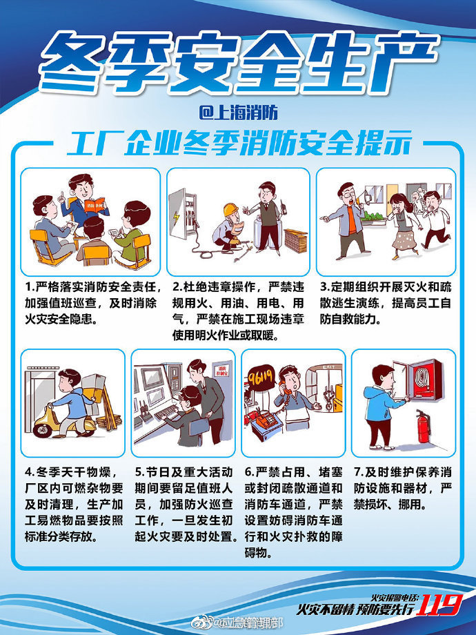 進(jìn)入冬季,工廠企業(yè)安全生產(chǎn)至關(guān)重要,各個(gè)生產(chǎn)單位切記做好檢查工作,防患于未然。加強(qiáng)值班巡查、嚴(yán)禁在施工現(xiàn)場(chǎng)違章使用明火作業(yè)或取暖、定期組織開展滅火和疏散逃生演練……工廠企業(yè)冬季消防安全,這幾點(diǎn)要注意!